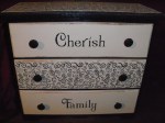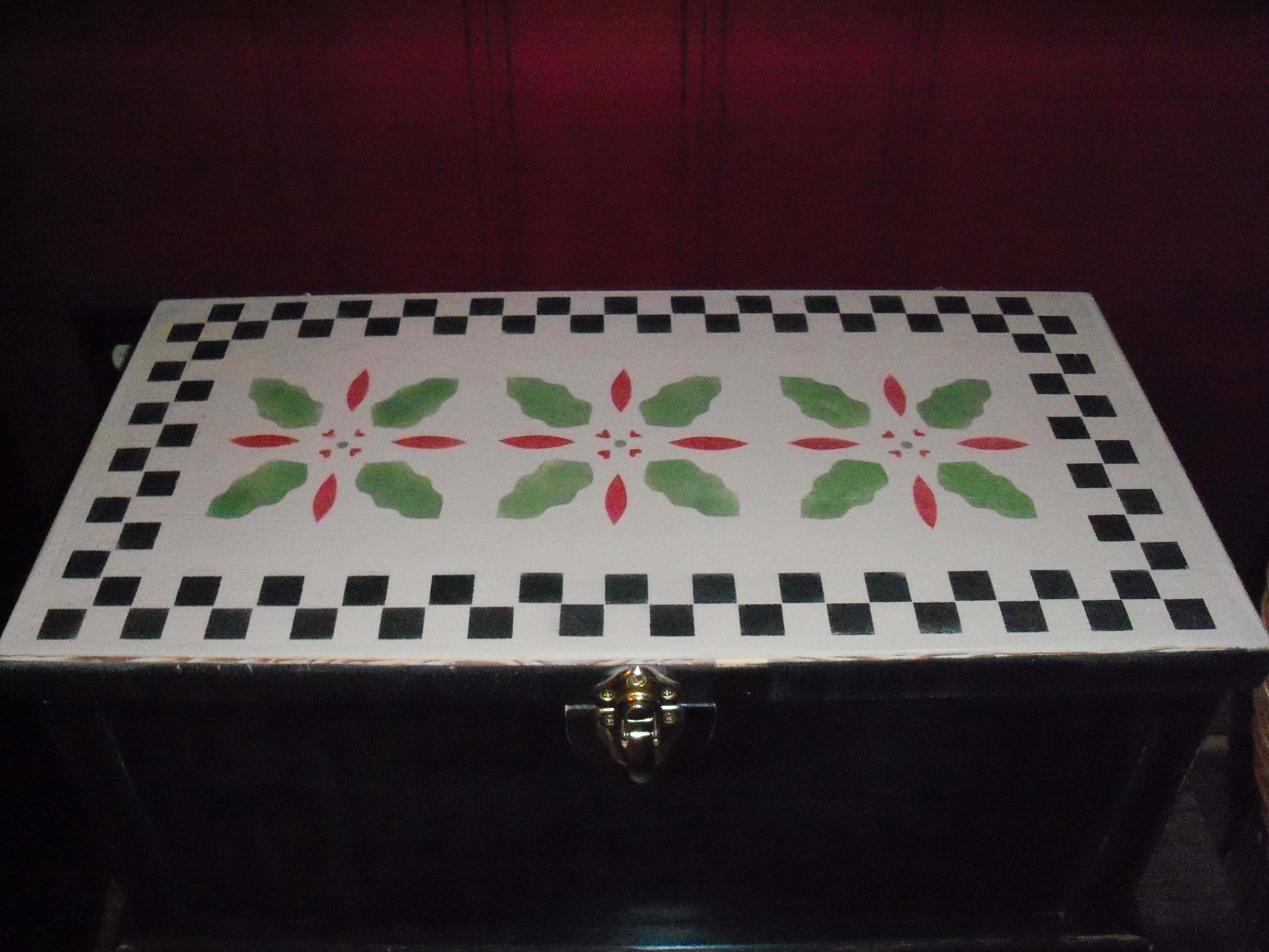 In the same room I decided to repurpose a couple of items I had, one was an old doll dresser from when I was a small girl and the other was a wooden chest given to me by a friend. I wanted to keep in the same color theme I had for the room so I painted them each black and tan and of course stenciled them ! Here is the result…..