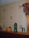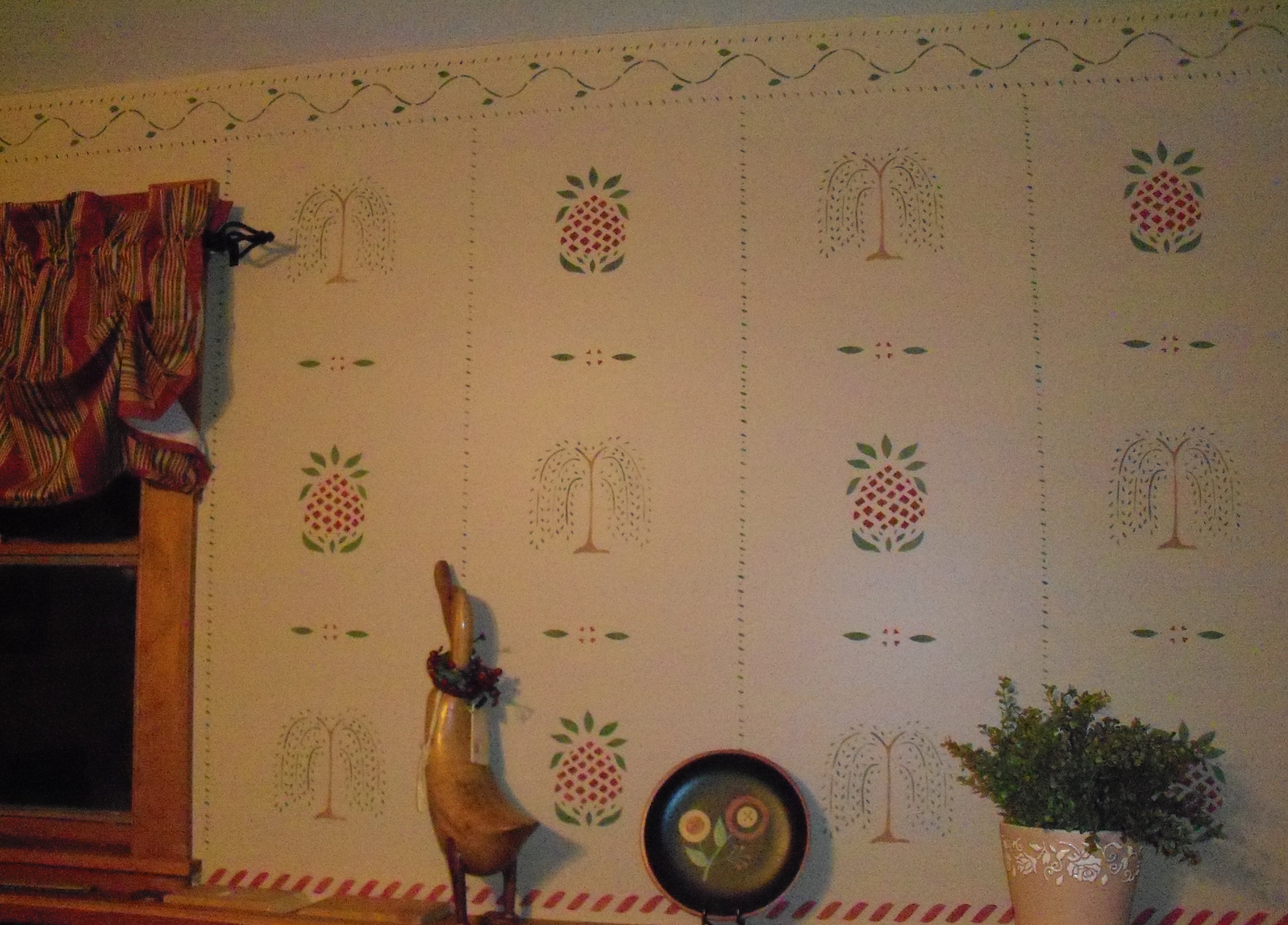 I have been a fan of stencilling for years. Many of the rooms in my house I have stenciled myself. I have done mostly borders and one ceiling medallion. One of my goals was to do a wall or part of a wall with historic stencils much like wall paper. So I did some research and found a great web site :http://www.mbhistoricdecor.com that chronicles the story behind this craft and shows homes throughout New England. My inspirations were from the Moses Eaton Collection. “We associate Moses Eaton’s patterns with Cape Cod Style houses, early American furniture, wide pine floorboards, hooked and braided rugs and pottery with good reason. Their simplicity and boldness lend an atmosphere of gaiety and informality to such a setting.